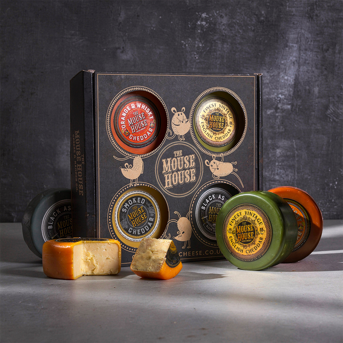 Enjoy a handpicked selection of four customer-favourite cheeses, elegantly arranged in our signature four-truckle gift box. This expertly chosen cheddar collection includes the bright, citrus-infused notes of Orange & Whisky cheddar, the dramatic character of Black as Coal charcoal cheddar, the rich intensity of Finest Vintage aged cheddar, and the subtle, mellow sweetness of naturally smoked cheddar. Specially selected for springtime occasions, it makes a wonderful Mother’s Day surprise or a delicious seasonal indulgence to savour at home.